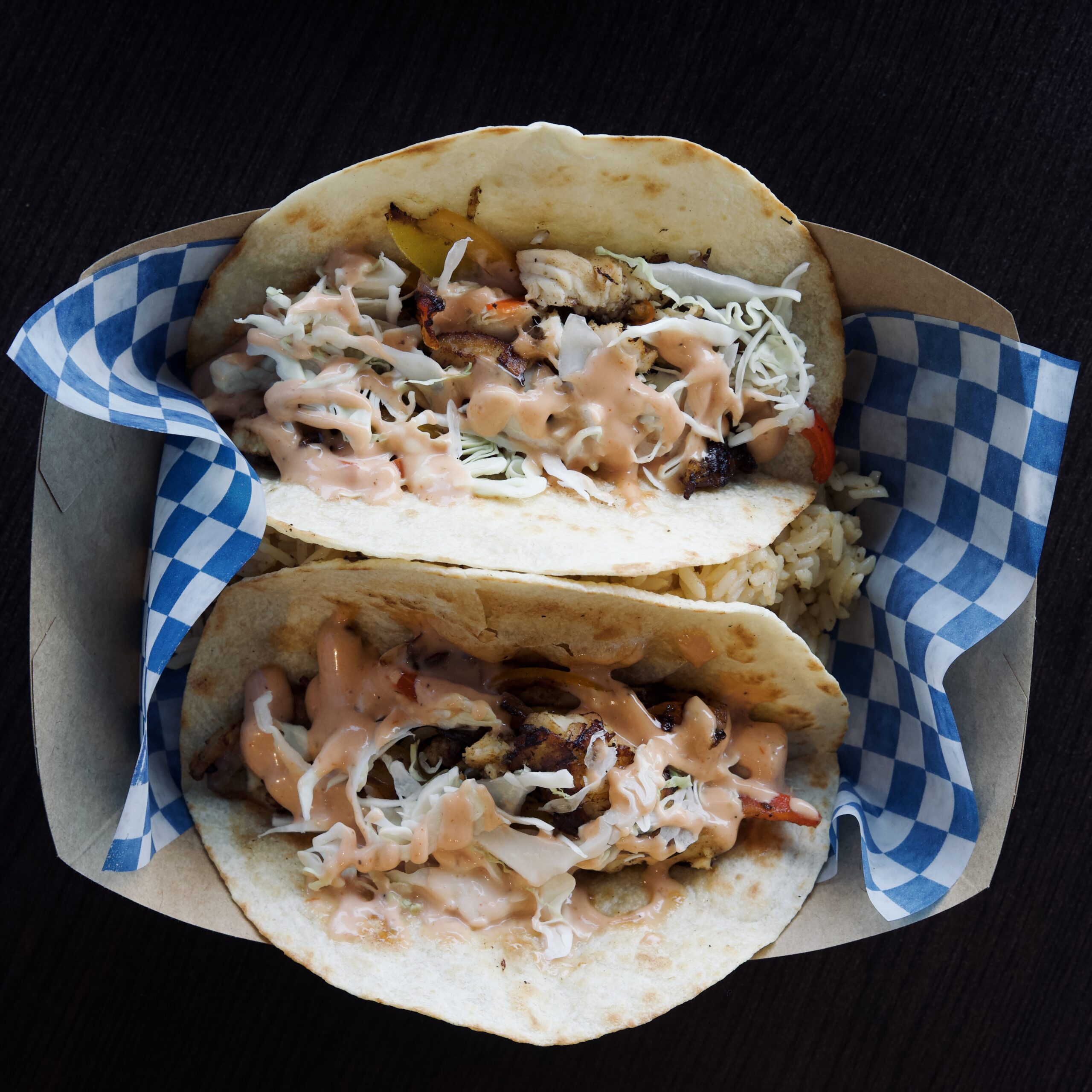 - Fish tacos w/rice or fries